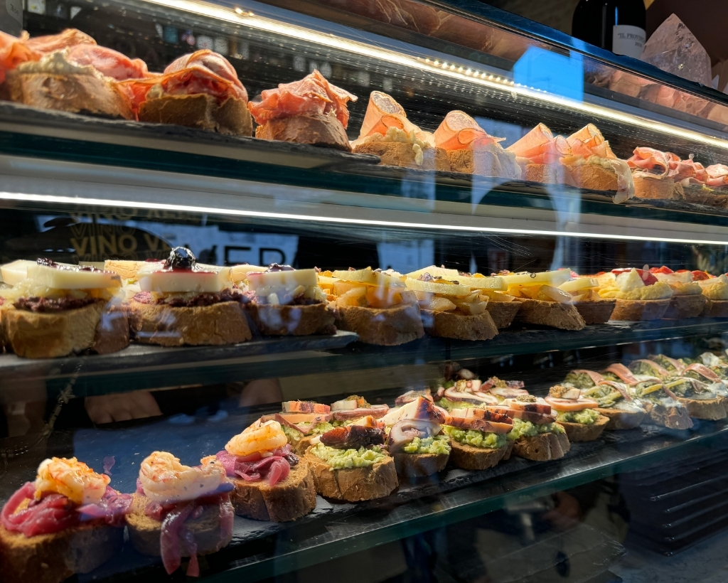 The cicchetti are as gourmet as they come: gorgonzola with honey and walnuts, anchovies with olives and pesto, red onion with variations of cheese and a drizzle of balsamic.